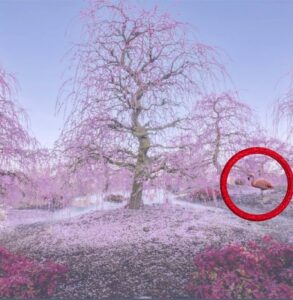 În acest cadru idilic se află, bine camuflat, un flamingo roz. Forma sa este integrată perfect printre florile de cireș, iar culoarea aproape identică îl face extrem de greu de observat la prima privire. Nu este vorba doar de viteză, ci de capacitatea ta de a separa detaliile relevante de fundalul încărcat vizual.