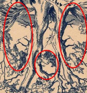 În varianta explicată a imaginii, chipurile devin mult mai ușor de recunoscut: liniile, umbrele și contururile se unesc pentru a forma fețe umane clare, care anterior păreau doar elemente de fundal.