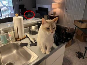 În imaginea propusă, două pisici sunt ușor de observat, aflate în prim-plan, într-un decor obișnuit dintr-o locuință. Însă mai există încă una, bine camuflată.