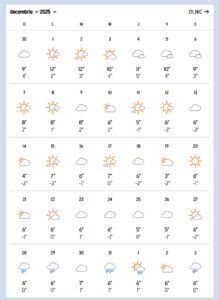 Luna decembrie debutează cu temperaturi mai ridicate decât ar fi normal pentru această perioadă. Primele zile aduc maxime între 8 și 12°C, cu minime nocturne ce coboară spre 4°C, insuficient pentru formarea unui strat de zăpadă persistent. Cerul rămâne schimbător, cu alternanțe între nori și perioade scurte de înseninări.