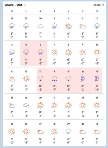 Ianuarie se remarcă prin contrastul tot mai accentuat dintre zilele cu aspect hibernal și perioadele relativ luminoase, dar reci. În primele zile ale lunii predomină cerul noros, ploile și ocazional precipitațiile mixte. Temperaturile maxime se situează între 4 și 6°C, iar minimele nocturne ating 0°C sau scad ușor sub acest prag.