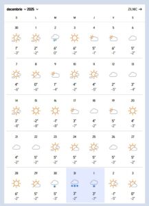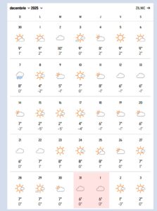 La Predeal, pe 31 decembrie, temperaturile vor varia între 3°C și –6°C, oferind condiții propice pentru precipitații sub formă de ninsoare. În prima zi din 2026, mercurul din termometre va indica aproximativ 3°C maxima și –7°C minima – valori ideale pentru cei care visează la un Revelion petrecut într-un peisaj hibernal.