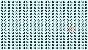La prima vedere, toate literele par identice. Tocmai aici intervine dificultatea: litera „Q” seamănă extrem de mult cu „O”, diferența fiind dată doar de micuța coadă specifică lui „Q”. Creierul tinde să „completeze” automat formele repetitive, ceea ce face ca litera diferită să fie ignorată ușor.